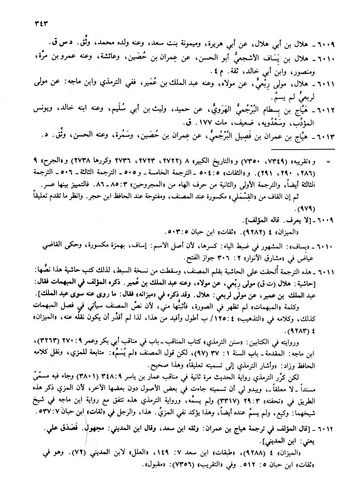 6012- هياج بن بسطام البرجمي الهروي عن حميد وليث بن أبي سليم وعنه ابنه خالد ويونس المؤدب وسعدويه ضعيف مات 177 ق
