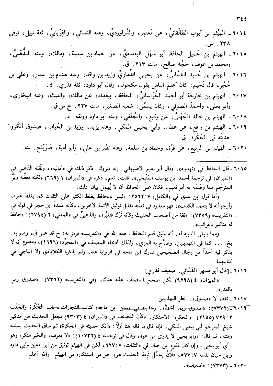 6015- الهيثم بن جميل الحافظ أبو سهل البغدادي عن حماد بن سلمة ومالك وعنه الذهلي ومحمد بن عوف حجة صالح مات 213 ق