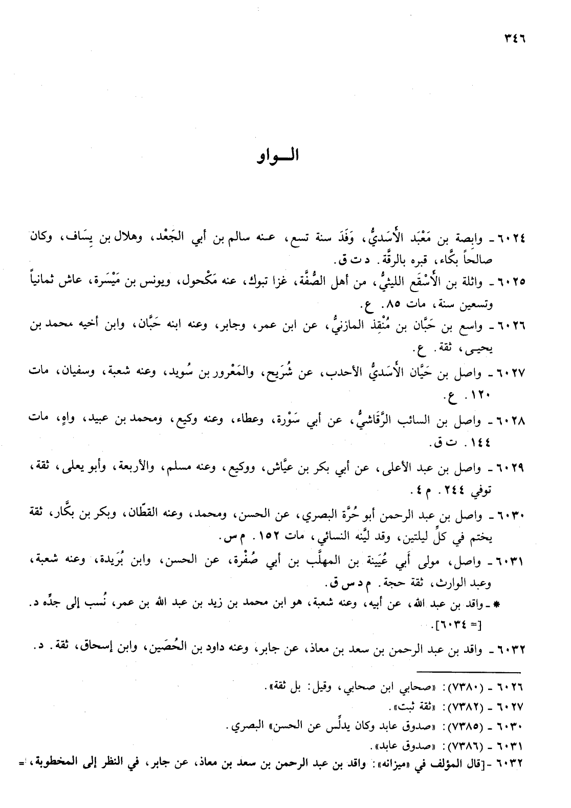 6031- واصل مولى أبي عيينة بن المهلب بن أبي صفرة عن الحسن وابن بريدة وعنه شعبة وعبد الوارث ثقة حجة م د س ق واقد بن عبد الله عن أبيه وعنه شعبة هو بن محمد بن زيد بن عبد الله بن عمر نسب إلى جده دواقد بن عبد الله عن أبيه وعنه شعبة هو بن محمد بن زيد بن عبد الله بن عمر نسب إلى جده د 6034
