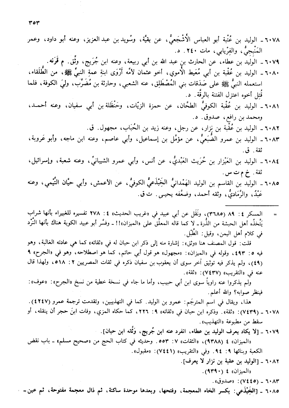 6078- الوليد بن عتبة أبو العباس الاشجعي عن بقية وسويد بن عبد العزيز وعنه أبو داود وعمر المنبجي والفريابي مات 24 د