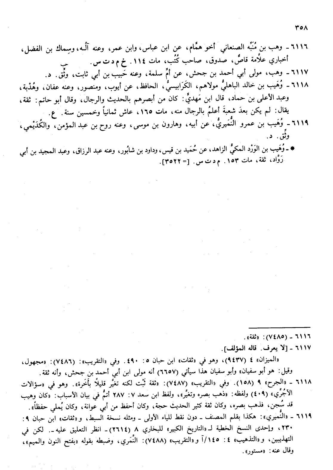 6118- وهيب بن خالد الباهلي مولاهم الكرابيسي الحافظ عن أيوب ومنصور وعنه عفان وهدبة وعبد الاعلى بن حماد قال بن مهدي كان من أبصرهم بالحديث والرجال وقال أبو حاتم ثقة يقال لم يكن بعد شعبة أعلم بالرجال منه مات 165 عاش ثمانيا وخمسين سنة ع