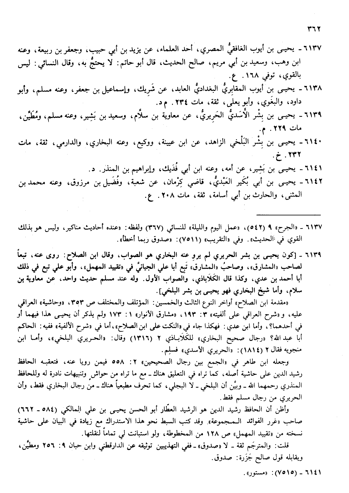6139- يحيى بن بشر الاسدي الحريري عن معاوية بن سلام وسعيد بن بشير وعنه مسلم ومطين مات 229 م