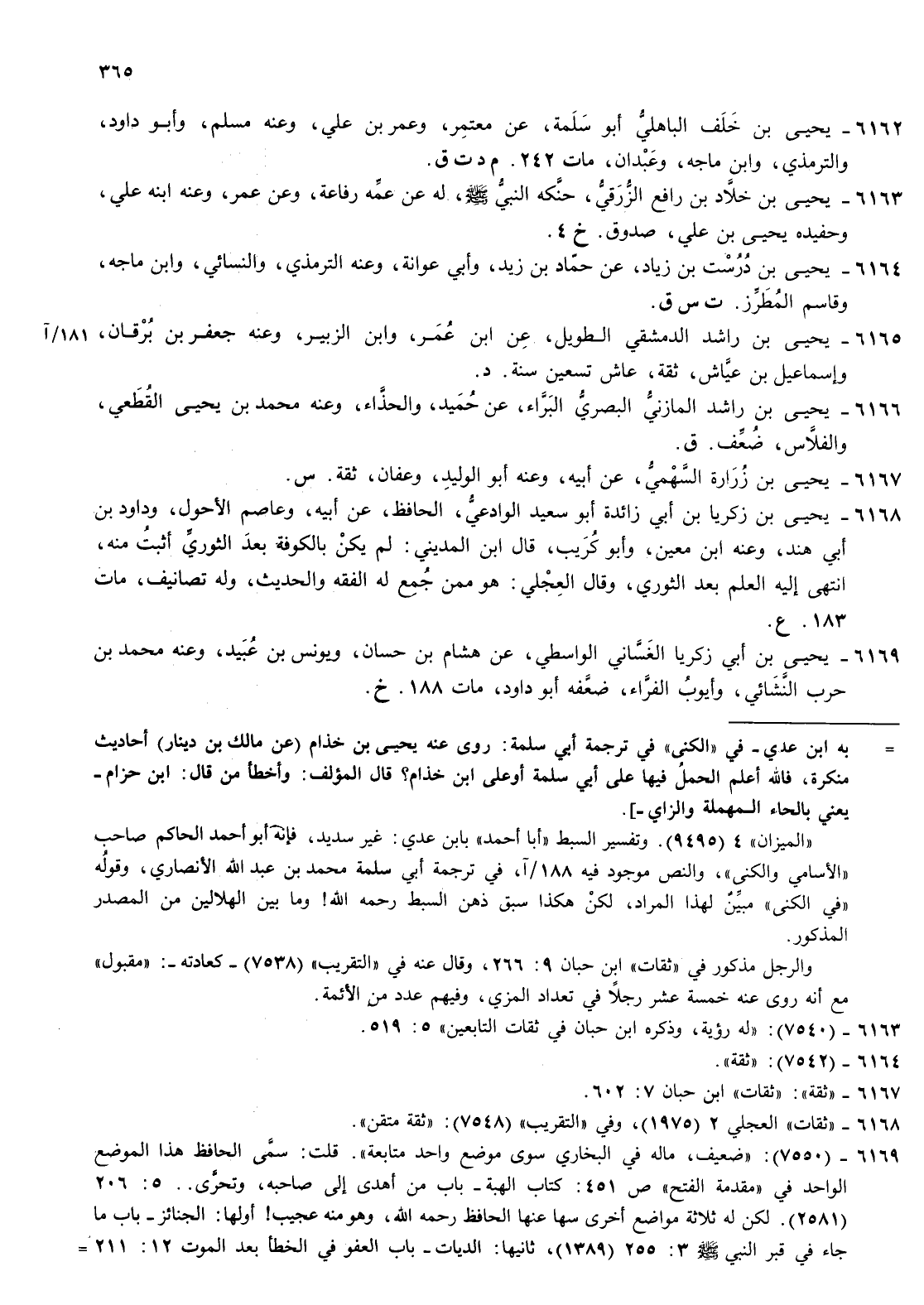 6168- يحيى بن زكريا بن أبي زائدة أبو سعيد الوادعي الحافظ عن أبيه وعاصم الاحول وداود بن أبي هند وعنه بن معين وأبو كريب قال بن المديني لم يكن بالكوفة بعد الثوري أثبت منه انتهى إليه العلم بعد الثوري وقال العجلي هو ممن جمع له الفقه والحديث وله تصانيف مات 183 ع