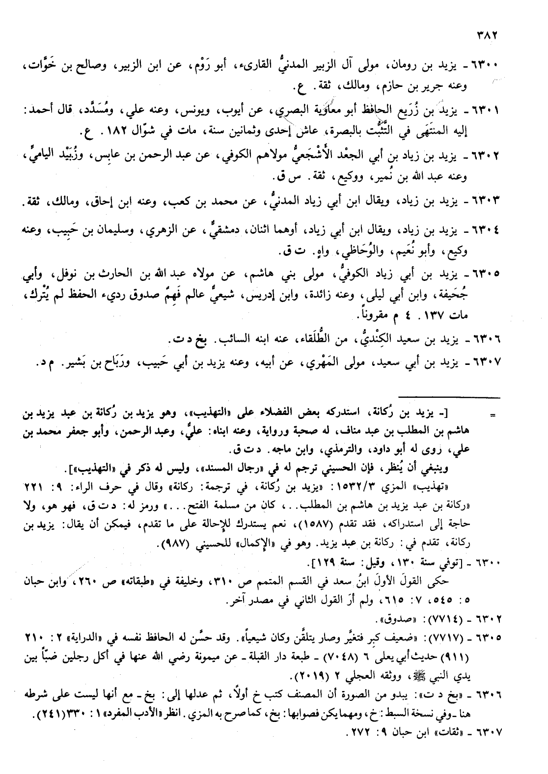 6301- يزيد بن زريع الحافظ أبو معاوية البصري عن أيوب ويونس وعنه علي ومسدد قال أحمد إليه المنتهي في التثبت بالبصرة عاش إحدى وثمانين سنة مات في شوال 182 ع