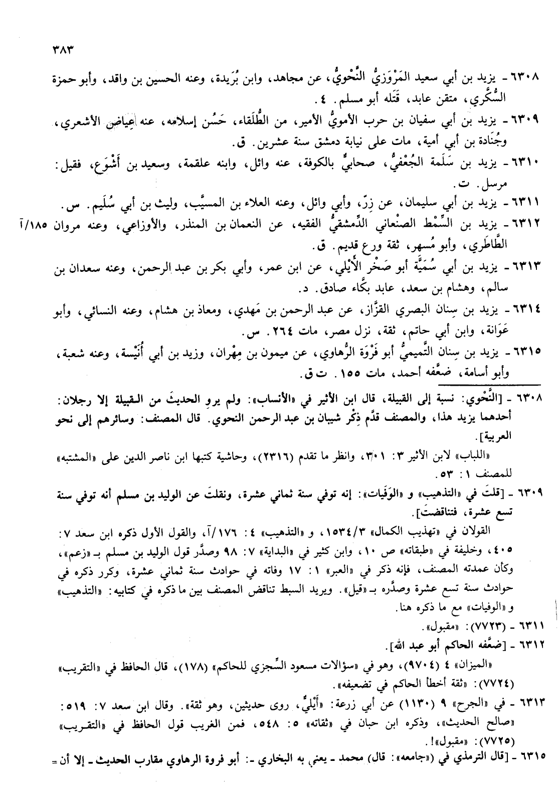 6308- يزيد بن أبي سعيد المروزي النحوي عن مجاهد وابن بريدة وعنه الحسين بن واقد وأبو حمزة السكري متقن عابد قتله أبو مسلم 4