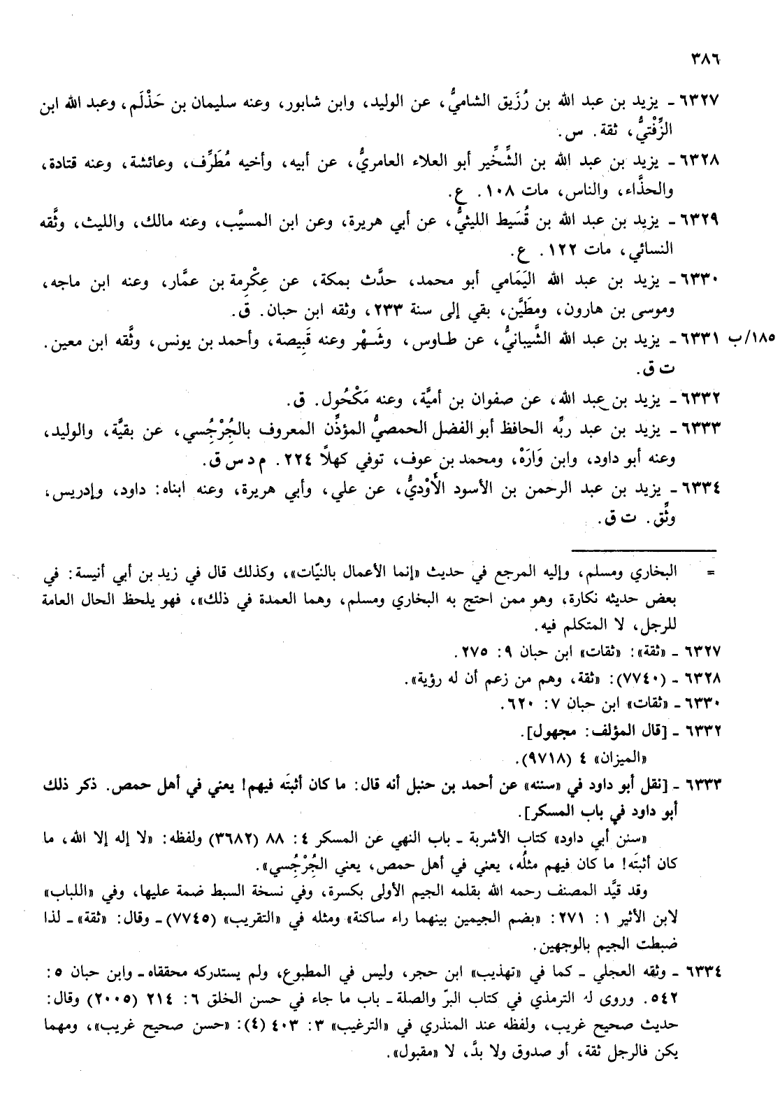 6333- يزيد بن عبد ربه الحافظ أبو الفضل الحمصي المؤذن المعروف بالجرجسي عن بقية والوليد وعنه أبو داود وابن واره ومحمد بن عوف توفي كهلا 224 م د س ق