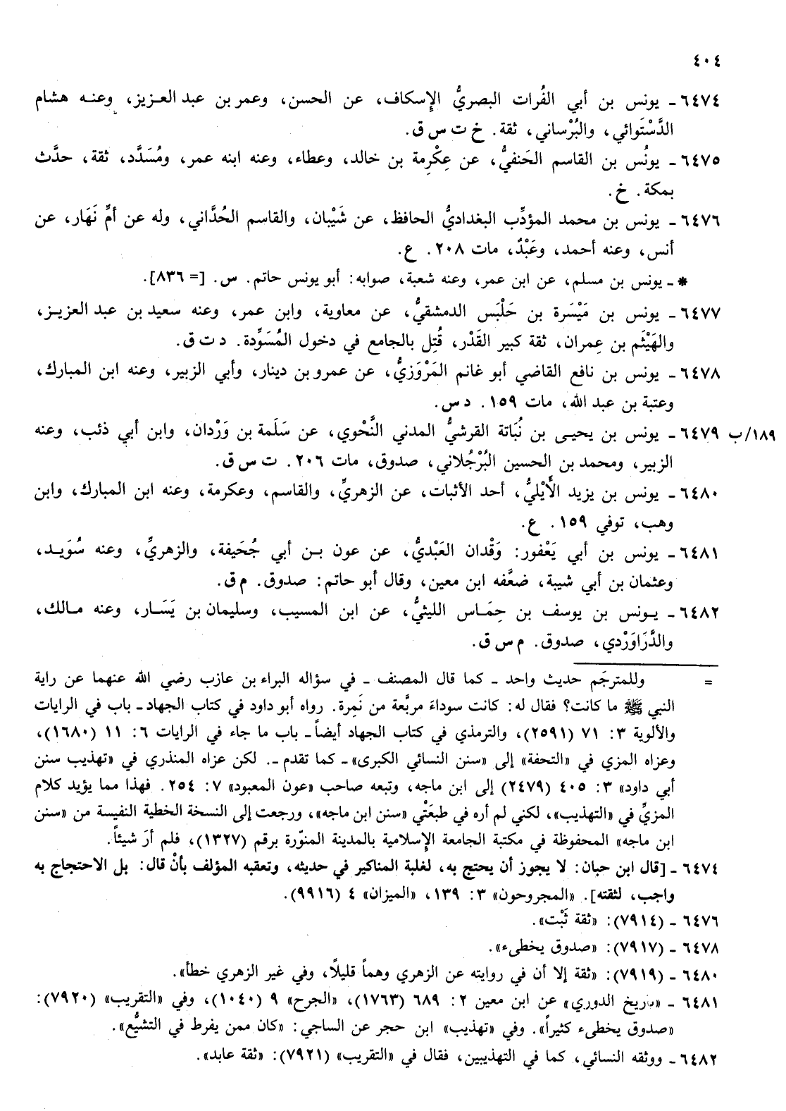 6476- يونس بن محمد المؤدب البغدادي الحافظ عن شيبان والقاسم الحداني وله عن أم نهار عن أنس وعنه أحمد وعبد مات 208 ع يونس بن مسلم عن بن عمر وعنه شعبة صوابه أبو يونس حاتم سيونس بن مسلم عن بن عمر وعنه شعبة صوابه أبو يونس حاتم س 836