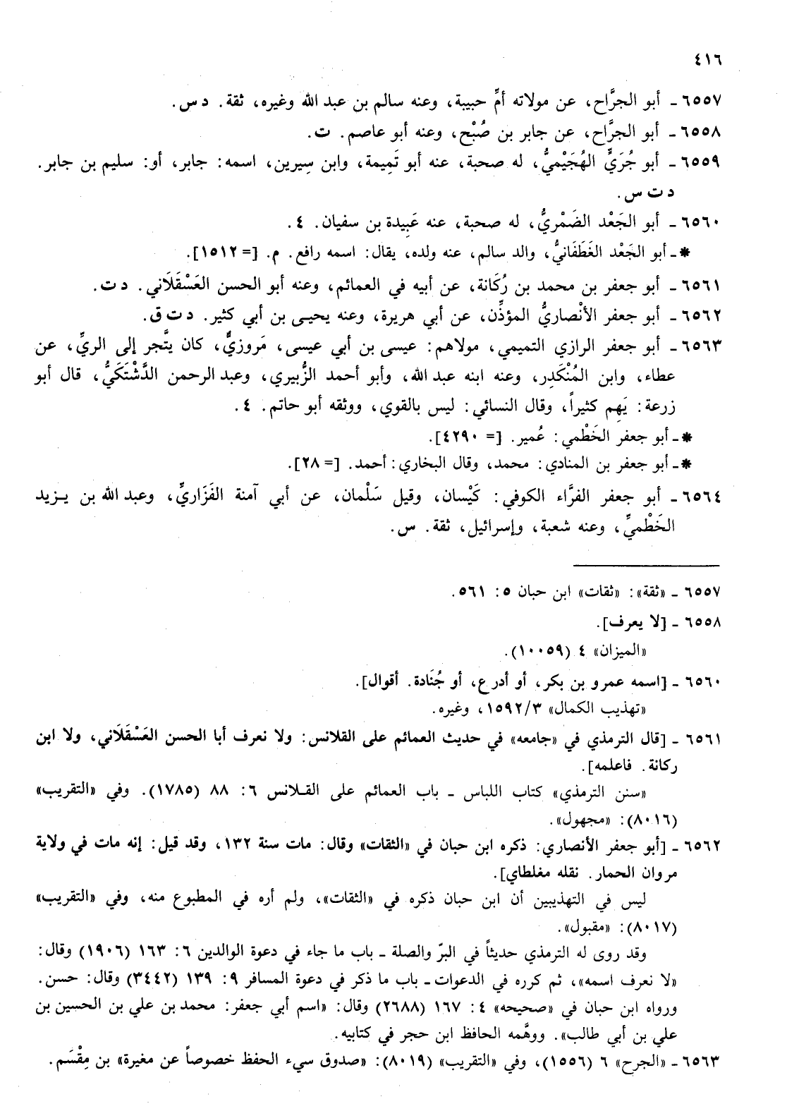 6563- أبو جعفر الرازي التميمي مولاهم عيسى بن أبي عيسى مروزي كان يتجر إلى الري عن عطاء وابن المنكدر وعنه ابنه عبد الله وأبو أحمد الزبيري وعبد الرحمن الدشتكي قال أبو زرعة يهم كثيرا وقال النسائي ليس بالقوي ووثقه أبو حاتم 4 أبو جعفر الخطمي عمير أبو جعفر الخطمي عمير 429 أبو جعفر بن المنادي محمد وقال البخاري أحمد أبو جعفر بن المنادي محمد وقال البخاري أحمد 28