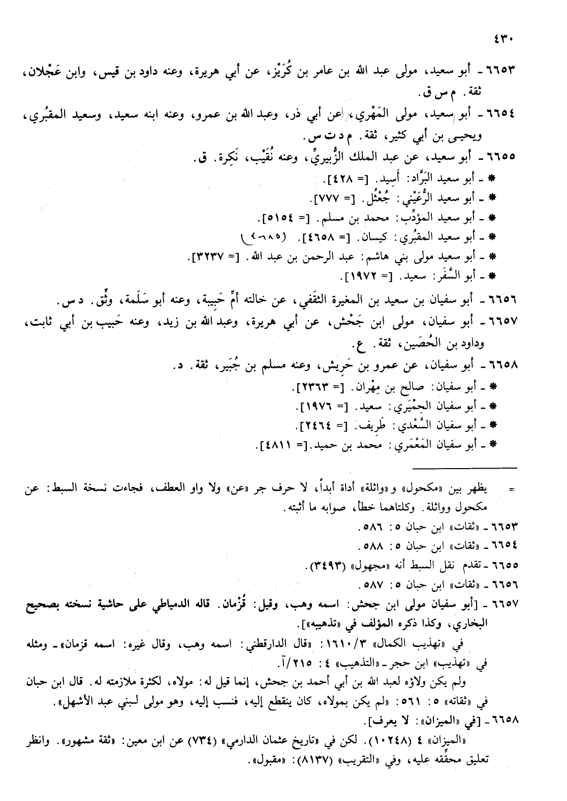 6654- أبو سعيد مولى المهري عن أبي ذر وعبد الله بن عمرو وعنه ابنه سعيد وسعيد المقبري ويحيى بن أبي كثير ثقة م د ت س