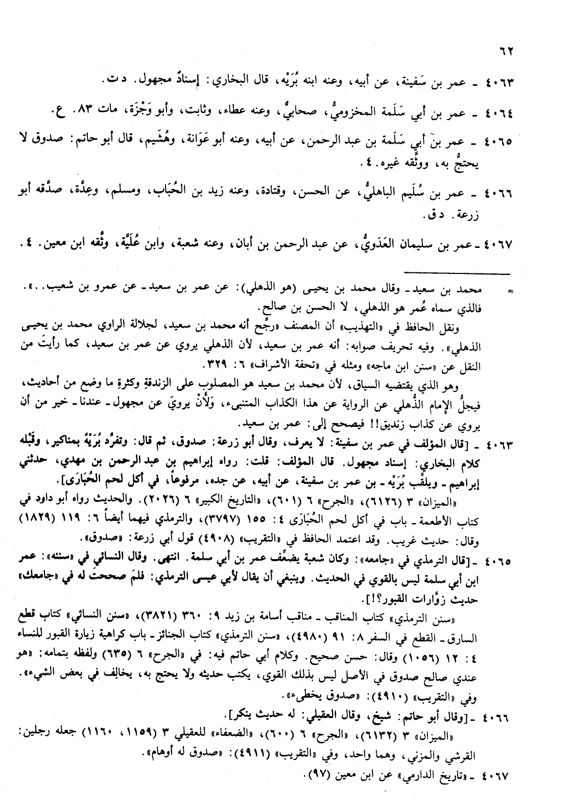 4063- عمر بن سفينة عن أبيه وعنه ابنه بريه قال البخاري إسناد مجهول د ت