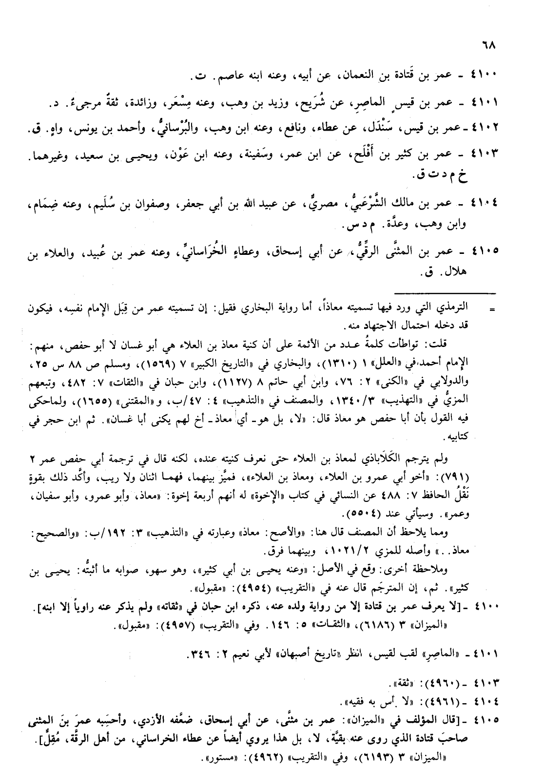 4105- عز وجل عمر بن المثنى الرقي عن أبي إسحاق وعطاء الخراساني وعنه عمر بن عبيد والعلاء بن هلال ق