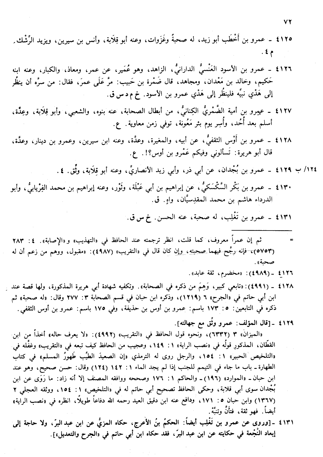 4127- عمرو بن أمية الضمري الكناني من أبطال الصحابة عنه بنوه والشعبي وأبو قلابة وعدة أسلم بعد أحد وأسر يوم بئر معونة توفي زمن معاوية ع