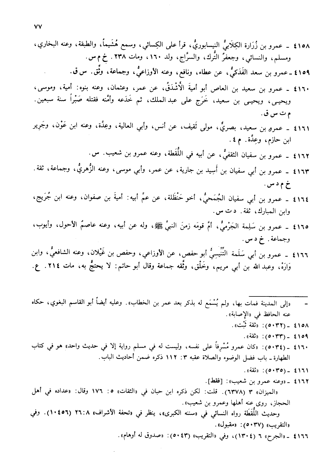 4158- عمرو بن زرارة الكلابي النيسابوري قرأ على الكسائي وسمع هشيما والطبقة وعنه البخاري ومسلم والنسائي وجعفر الترك والسراج ولد 16 ومات 238 خ م س