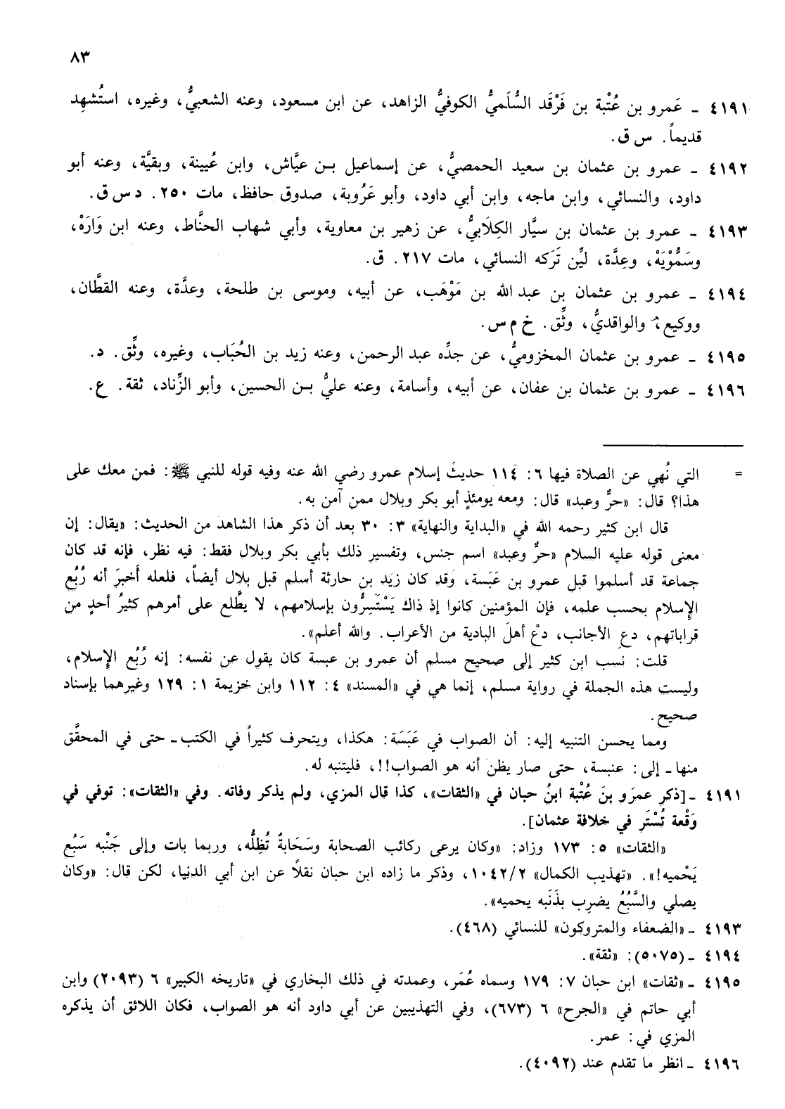 4192- عمرو بن عثمان بن سعيد الحمصي عن إسماعيل بن عياش وابن عيينة وبقية وعنه أبو داود والنسائي وابن ماجة وابن أبي داود وأبو عروبة صدوق حافظ مات 25 د س ق