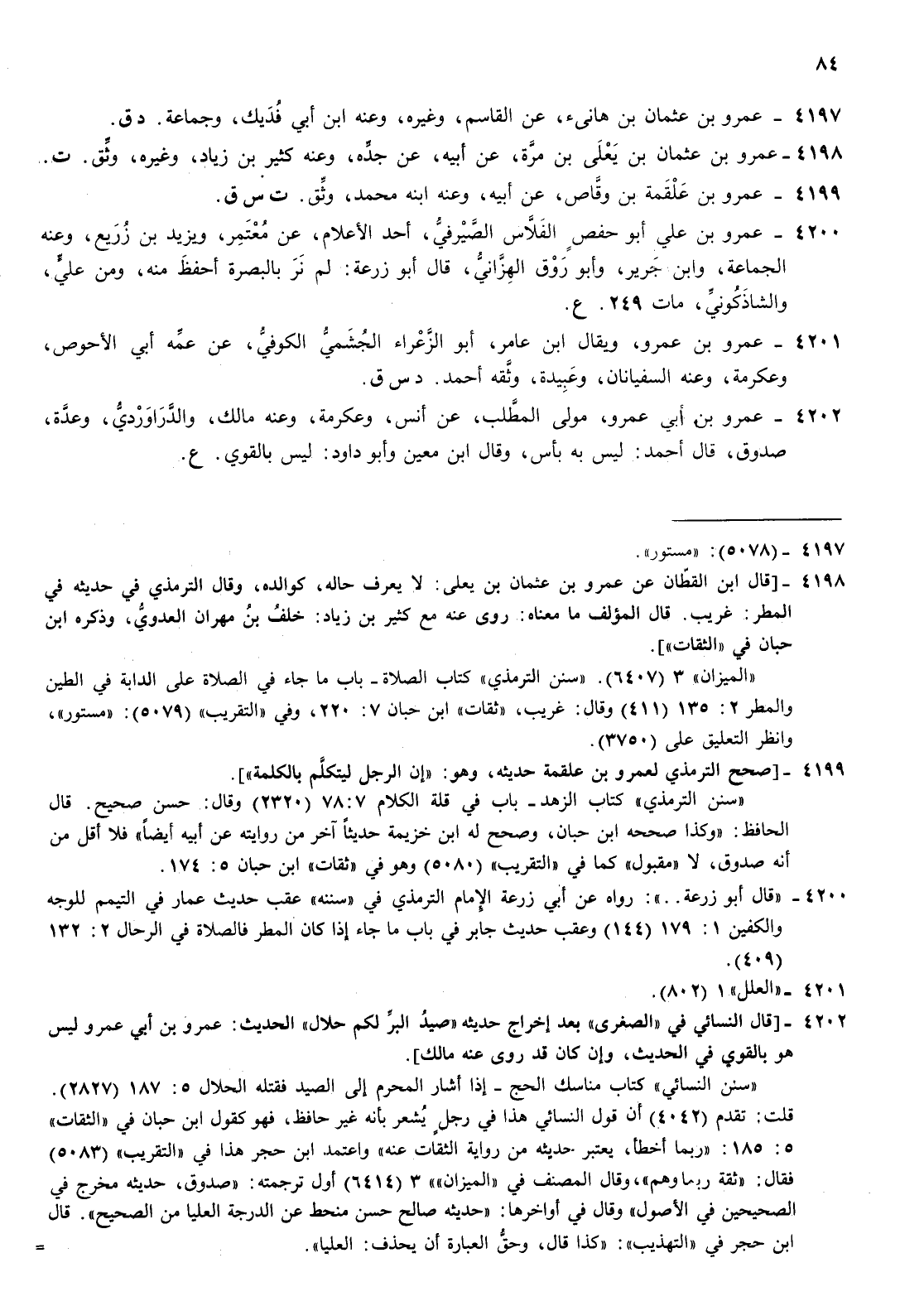 4200- عمرو بن علي أبو حفص الفلاس الصيرفي أحد الاعلام عن معتمر ويزيد بن زريع وعنه الجماعة وابن جرير وأبو روق الهزاني قال أبو زرعة لم نر بالبصرة أحفظ منه ومن علي والشاذكوني مات 249 ع