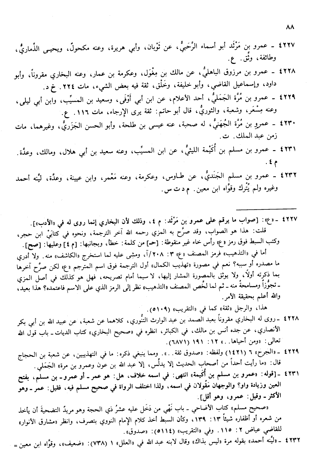 4229- عمرو بن مرة الجملي أحد الاعلام عن بن أبي أوفى وسعيد بن المسيب وابن أبي ليلى وعنه مسعر وشعبة والثوري قال أبو حاتم ثقة يرى الارجاء مات 116 ع