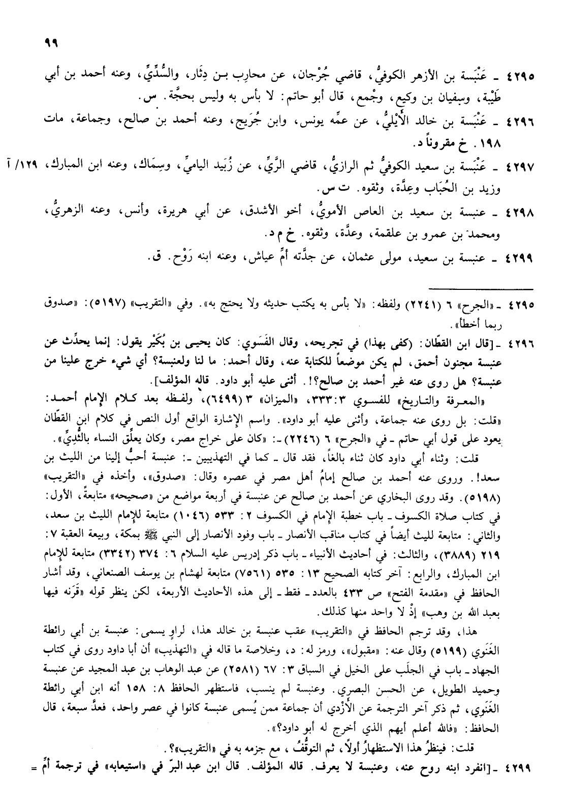 4297- عنبسة بن سعيد الكوفي ثم الرازي قاضي الري عن زبيد اليامي وسماك وعنه بن المبارك
