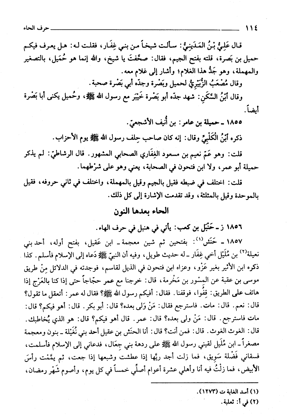 قال عليّ بن المدينيّ: سألت شيخا من بني غفار، فقلت له: هل يعرف فيكم حميل بن بصرة، قلته بفتح الجيم، فقال: صحّفت يا شيخ، واللَّه إنما هو حميل، بالتصغير والمهملة، وهو جدّ هذا الغلام، وأشار إلى غلام معه.