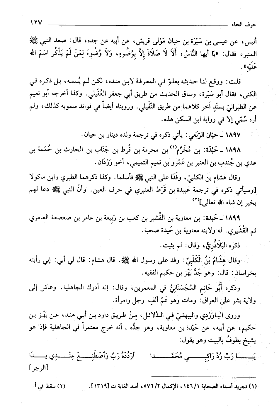 وروى الباوردي والبيهقيّ في الدّلائل، من طريق داود بن أبي هند، عن بهز بن حكيم، عن أبيه، عن حيدة بن معاوية، وهو جدّه- أنه خرج معتمرا في الجاهلية فإذا هو بشيخ يطوف بالبيت وهو يقول: