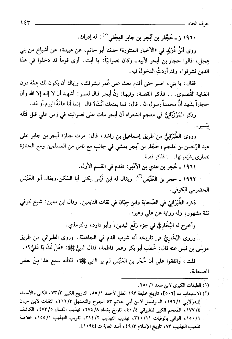 فقال: يا بني، اصبر حتى أقدم معك على عمر ليشرفك، وإياك أن يكون لك همّة دون الغاية القصوى ... فذكر القصة، وفيها: إنّ أبجر قال لعمر: أشهد أن لا إله إلا اللَّه وأن حجارا يشهد أنّ محمدا رسول اللَّه. قال: فما يمنعك أنت؟ قال: إنما أنا هامة اليوم أو غد.