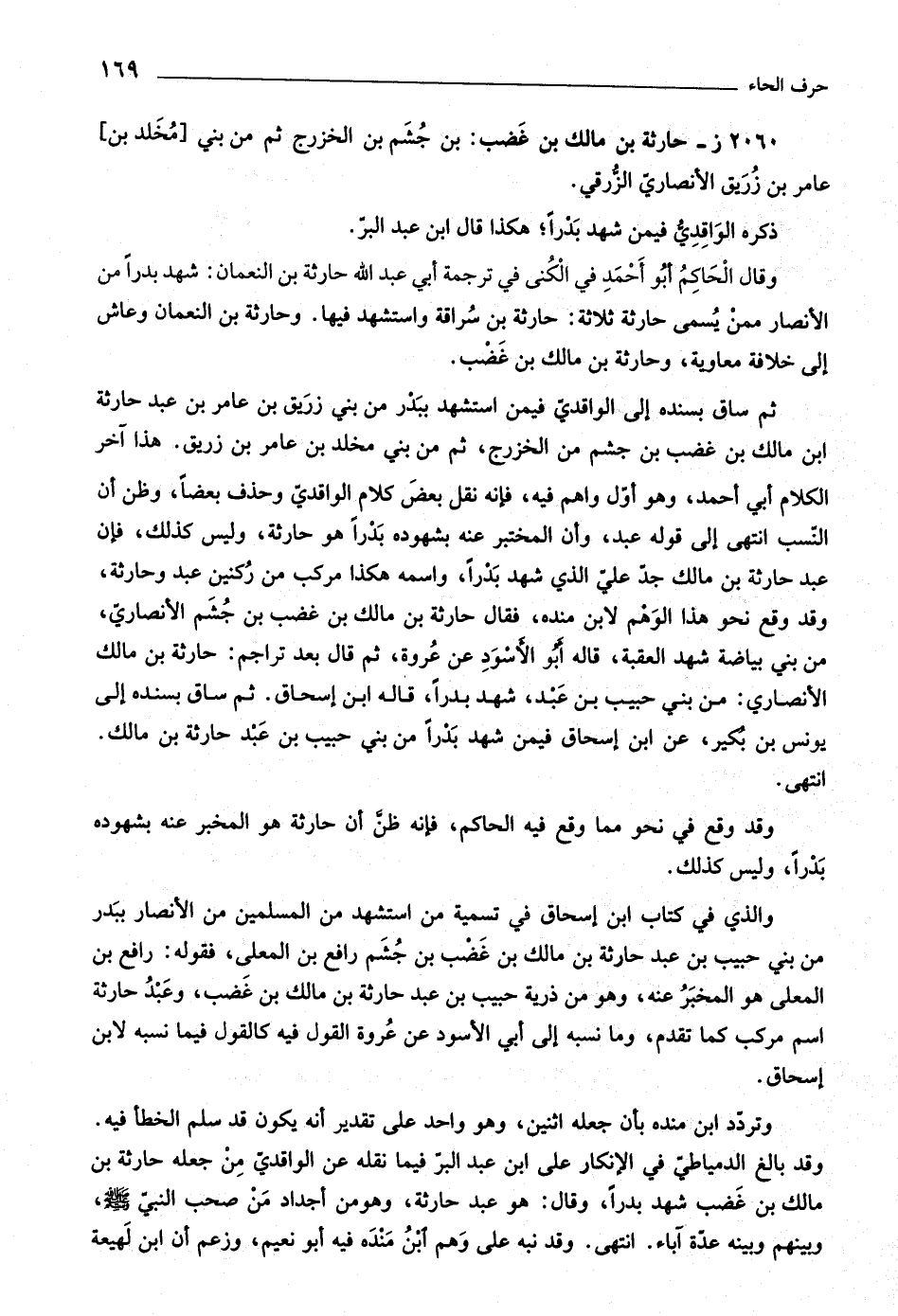 ثم ساق بسنده إلى الواقديّ فيمن استشهد ببدر من بني زريق بن عامر بن عبد حارثة ابن مالك بن غضب بن جشم من الخزرج، ثم من بني مخلد بن عامر بن زريق. هذا آخر الكلام أبي أحمد، وهو أوّل واهم فيه، فإنه نقل بعض كلام الواقديّ وحذف بعضا، وظن أن النّسب انتهى إلى قوله عبد، وأن المختبر عنه بشهوده بدرا هو حارثة، وليس كذلك، فإن عبد حارثة بن مالك جدّ عليّ الّذي شهد بدرا، واسمه هكذا مركب من ركنين عبد وحارثة، وقد وقع نحو هذا الوهم لابن مندة، فقال حارثة بن مالك بن غضب بن جشم الأنصاريّ، من بني بياضة شهد العقبة، قاله أبو الأسود عن عروة، ثم قال بعد تراجم: حارثة بن مالك الأنصاري: من بني حبيب بن عبد، شهد بدرا، قاله ابن إسحاق. ثم ساق بسنده إلى يونس بن بكير، عن ابن إسحاق فيمن شهد بدرا من بني حبيب بن عبد حارثة بن مالك.