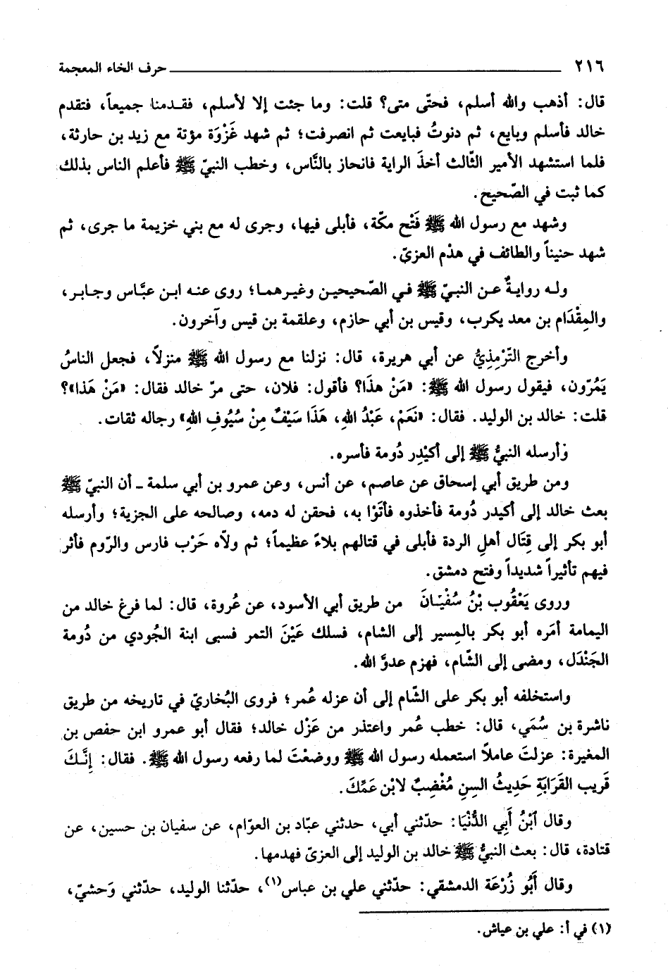 ومن طريق أبي إسحاق عن عاصم، عن أنس، وعن عمرو بن أبي سلمة- أن النبيّ صلّى اللَّه عليه وسلّم بعث خالد إلى أكيدر دومة فأخذوه فأتوا به، فحقن له دمه، وصالحه على الجزية، وأرسله أبو بكر إلى قتال أهل الردة فأبلى في قتالهم بلاء عظيما، ثم ولّاه حرب فارس والرّوم فأثر فيهم تأثيرا شديدا وفتح دمشق.