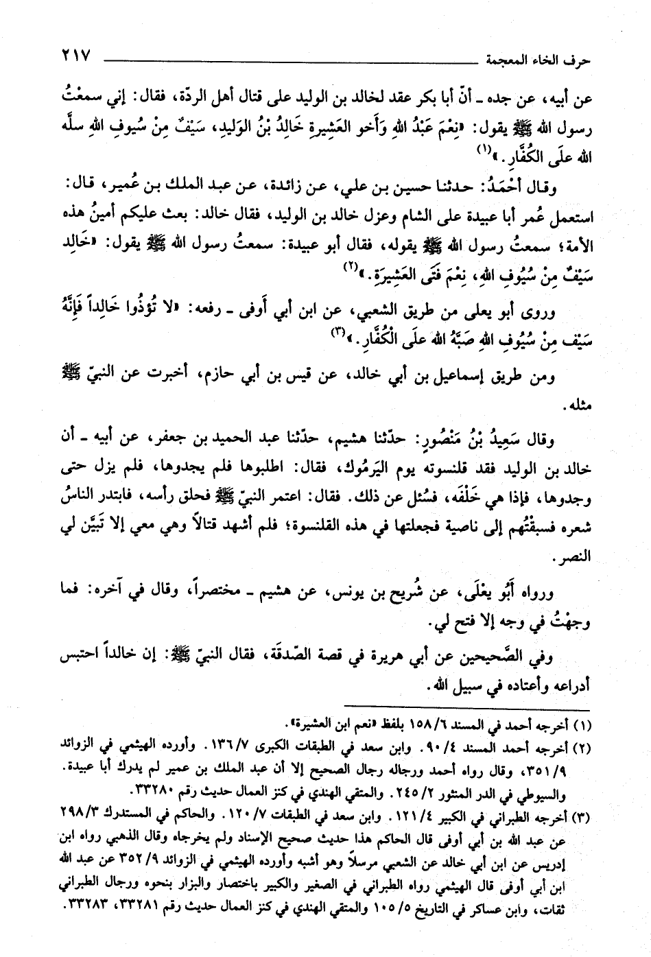 وروى أبو يعلى من طريق الشعبي، عن ابن أبي أوفى- رفعه: «لا تؤذوا خالدا فإنّه سيف من سيوف اللَّه صبّه اللَّه على الكفّار.» «٣»