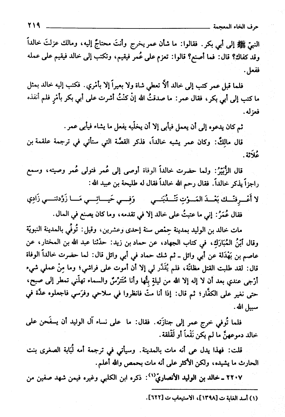 قال الزّبير: ولما حضرت خالدا الوفاة أوصى إلى عمر فتولى عمر وصيته، وسمع راجزا يذكر خالدا. فقال رحم اللَّه خالدا فقال له طليحة بن عبيد اللَّه: