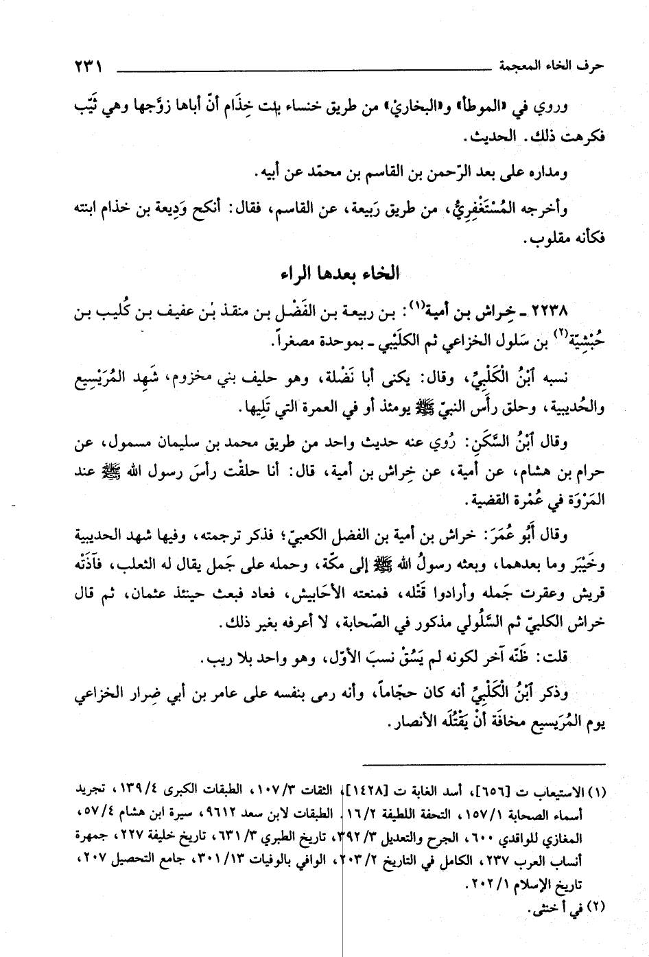 وقال أبو عمر: خراش بن أمية بن الفضل الكعبيّ، فذكر ترجمته، وفيها شهد الحديبيّة وخيبر وما بعدهما، وبعثه رسول اللَّه صلّى اللَّه عليه وسلّم إلى مكّة، وحمله على جمل يقال له الثعلب، فآذته قريش وعقرت جمله وأرادوا قتله، فمنعته الأحابيش، فعاد فبعث حينئذ عثمان، ثم قال خراش الكبيّ ثم السّلولي مذكور في الصّحابة، لا أعرفه بغير ذلك.