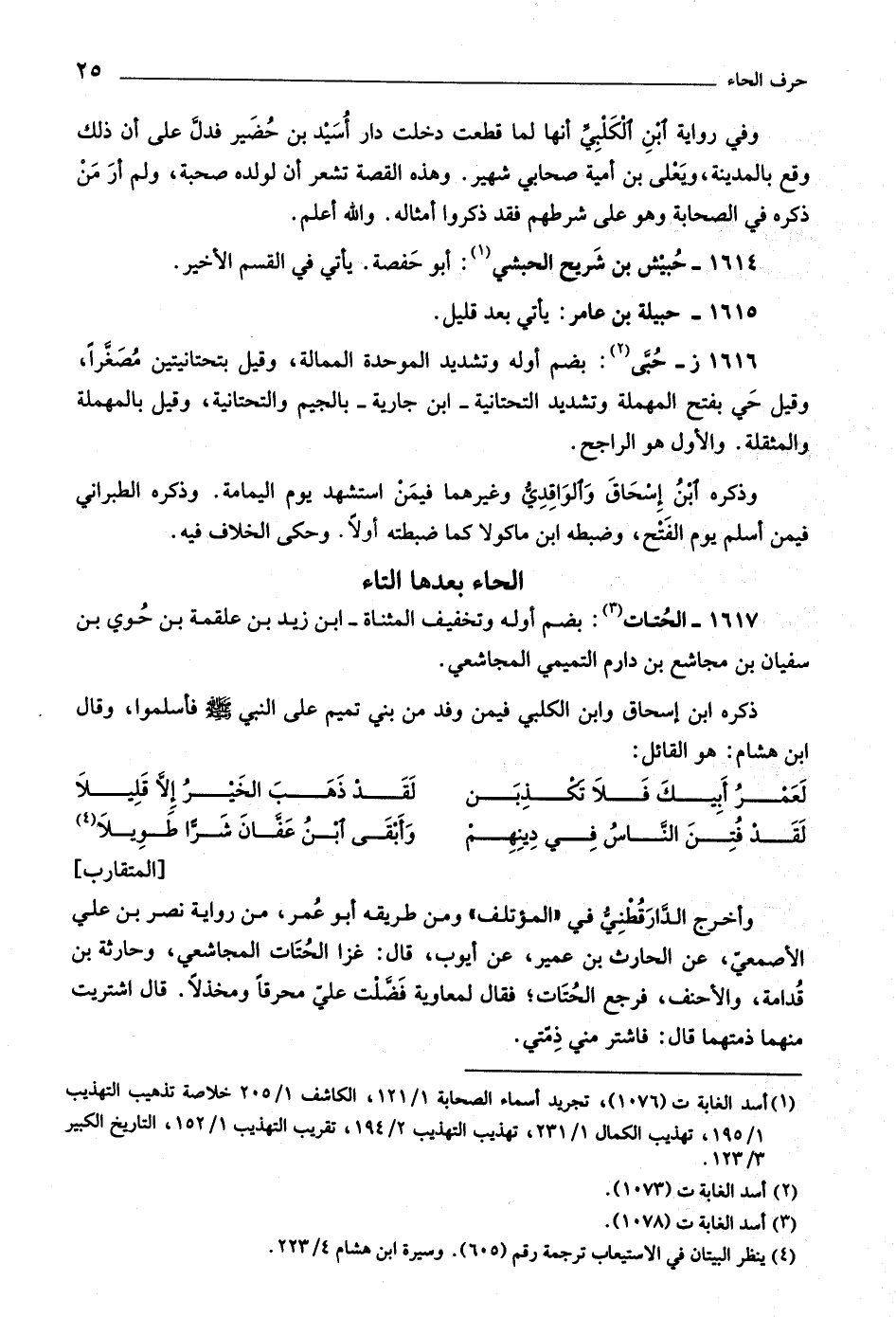 «٤» [المتقارب] وأخرج الدّارقطنيّ في «المؤتلف» ومن طريقه أبو عمر، من رواية نصر بن علي الأصمعيّ، عن الحارث بن عمير، عن أيوب، قال: غزا الحتات المجاشعي، وحارثة بن قدامة، والأحنف، فرجع الحتات، فقال لمعاوية فضّلت عليّ محرقا ومخذلا. قال اشتريت منهما ذمتهما قال: فاشتر مني ذمّتي.