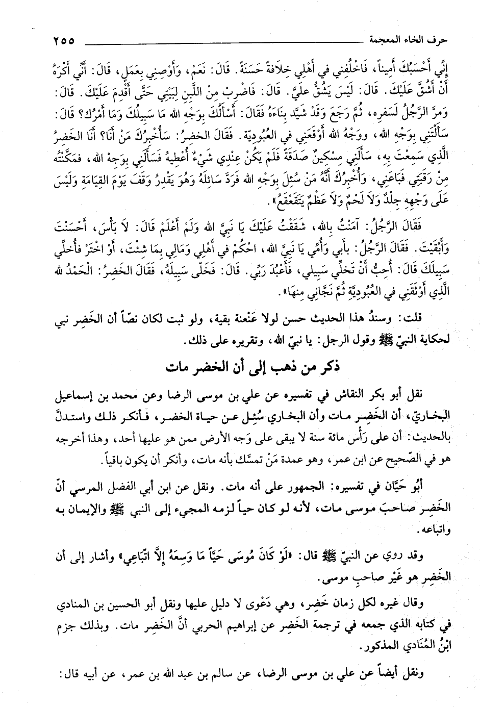 وقال غيره لكل زمان خضر، وهي دعوى لا دليل عليها ونقل أبو الحسين بن المنادي في كتابه الّذي جمعه في ترجمة الخضر عن إبراهيم الحربي أنّ الخضر مات. وبذلك جزم ابن المنادي المذكور.
