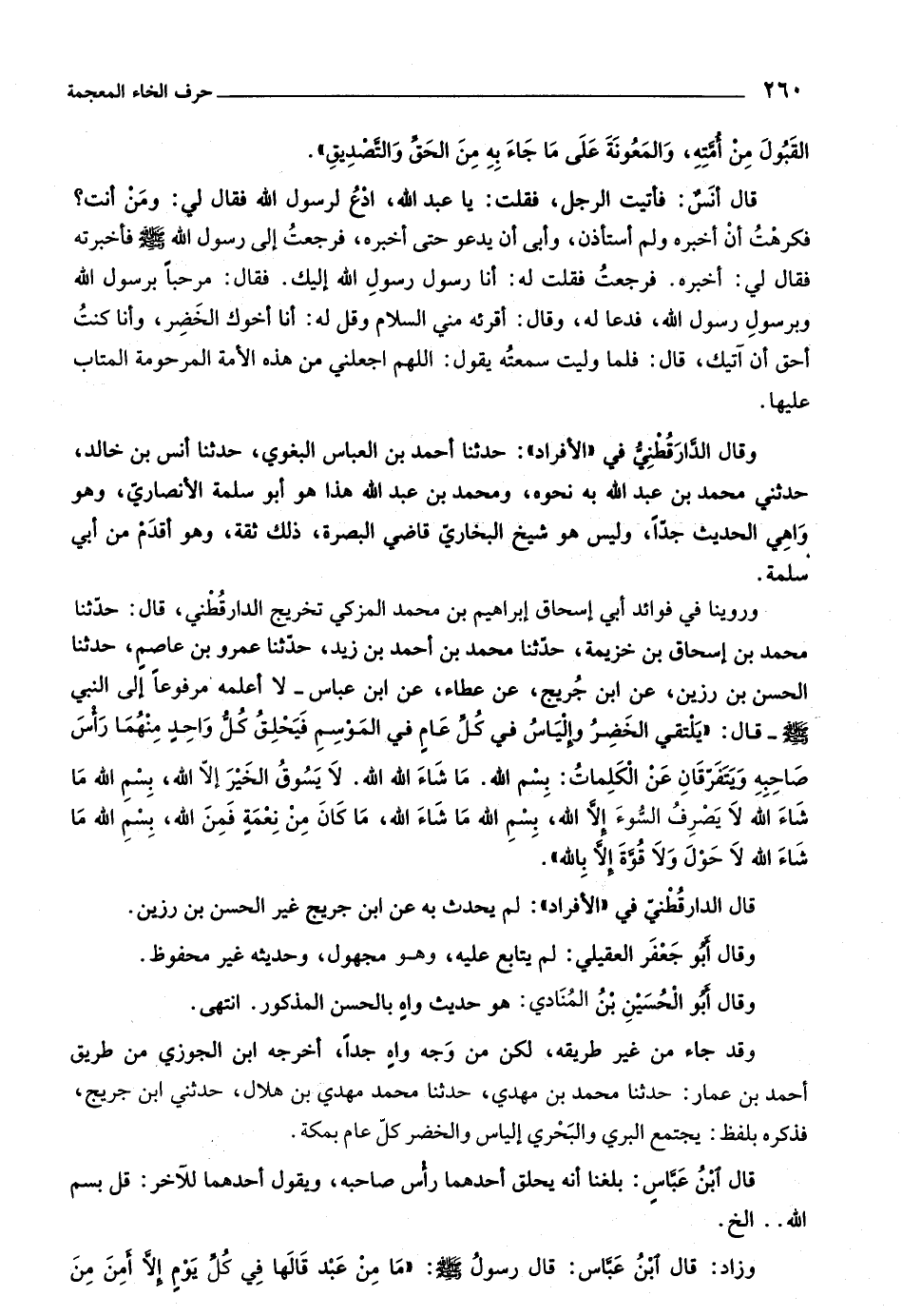 وروينا في فوائد أبي إسحاق إبراهيم بن محمد المزكي تخريج الدارقطنيّ، قال: حدّثنا محمد بن إسحاق بن خزيمة، حدّثنا محمد بن أحمد بن زيد، حدّثنا عمرو بن عاصم، حدثنا الحسن بن رزين، عن ابن جريج، عن عطاء، عن ابن عباس- لا أعلمه مرفوعا إلى النبي صلّى اللَّه عليه وسلّم- قال: «يلتقي الخضر وإلياس في كلّ عام في الموسم فيحلق كلّ واحد منهما رأس صاحبه ويتفرّقان عن الكلمات: بسم اللَّه. ما شاء اللَّه اللَّه. لا يسوق الخير إلّا اللَّه، بسم اللَّه ما شاء اللَّه لا يصرف السّوء إلّا اللَّه، بسم اللَّه ما شاء اللَّه، ما كان من نعمة فمن اللَّه، بسم اللَّه ما شاء اللَّه لا حول ولا قوّة إلّا باللَّه» .