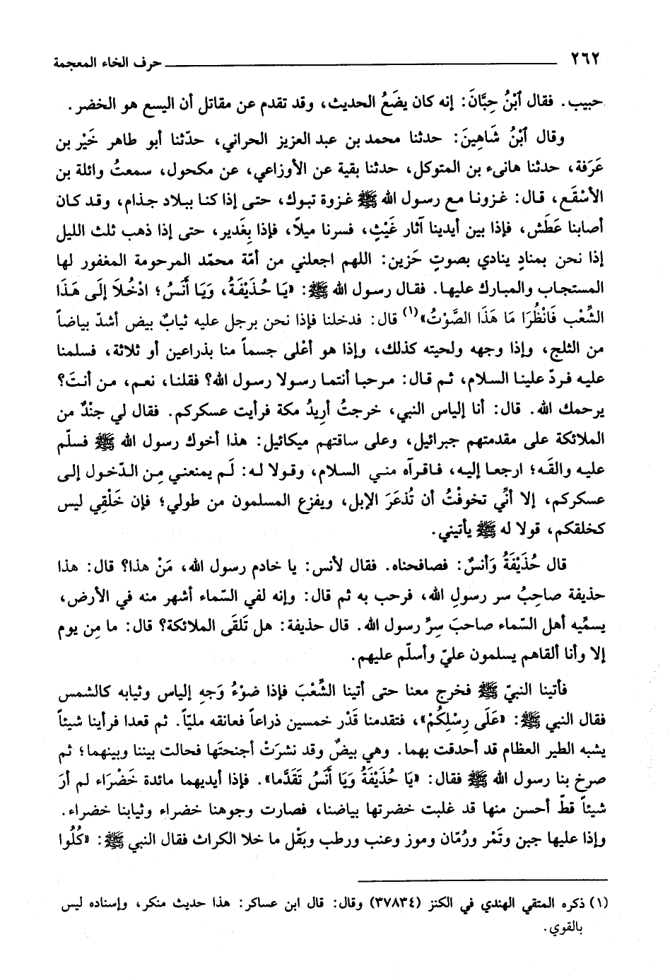 وقال ابن شاهين: حدثنا محمد بن عبد العزيز الحراني، حدّثنا أبو طاهر خير بن عرفة، حدثنا هانئ بن المتوكل، حدثنا بقية عن الأوزاعي، عن مكحول، سمعت وائلة بن الأسقع، قال: غزونا مع رسول اللَّه صلّى اللَّه عليه وسلّم غزوة تبوك، حتى إذا كنا ببلاد جذام، وقد كان أصابنا عطش، فإذا بين أيدينا آثار غيث، فسرنا ميلا، فإذا بغدير، حتى إذا ذهب ثلث الليل إذا نحن بمناد ينادي بصوت حزين: اللَّهمّ اجعلني من أمّة محمّد المرحومة المغفور لها المستجاب والمبارك عليها. فقال رسول اللَّه صلّى اللَّه عليه وسلّم: «يا حذيفة، ويا أنس، ادخلا إلى هذا الشّعب فانظرا ما هذا الصّوت» «١» قال: فدخلنا فإذا نحن برجل عليه ثياب بيض أشدّ بياضا من الثلج، وإذا وجهه ولحيته كذلك، وإذا هو أعلى جسما منا بذراعين أو ثلاثة، فسلمنا عليه فردّ علينا السلام، ثم قال: مرحبا أنتما رسولا رسول اللَّه؟ فقلنا، نعم، من أنت؟