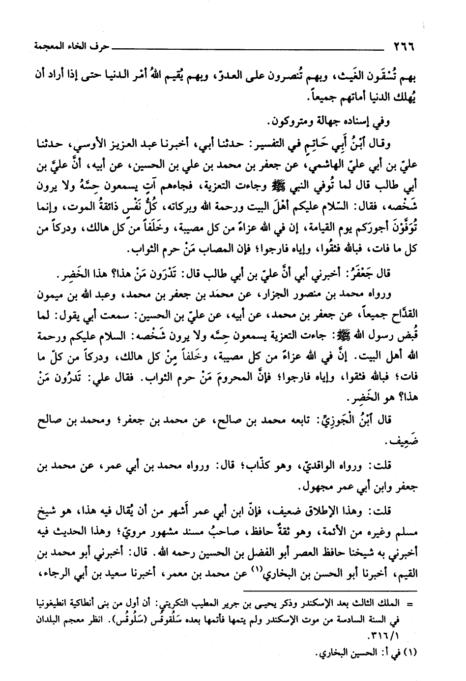 ورواه محمد بن منصور الجزار، عن محمد بن جعفر بن محمد، وعبد اللَّه بن ميمون القدّاح جميعا، عن جعفر بن محمد، عن أبيه، عن عليّ بن الحسين: سمعت أبي يقول: لما قبض رسول اللَّه صلّى اللَّه عليه وسلّم: جاءت التعزية يسمعون حسّه ولا يرون شخصه: السلام عليكم ورحمة اللَّه أهل البيت. إنّ في اللَّه عزاء من كل مصيبة، وخلفا من كل هالك، ودركا من كلّ ما فات، فباللَّه فثقوا، وإياه فارجوا، فإنّ المحروم من حرم الثواب. فقال علي: تدرون من هذا؟ هو الخضر.