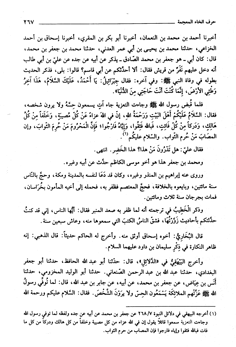 أخبرنا أحمد بن محمد بن النعمان، أخبرنا أبو بكر بن المقري، أخبرنا إسحاق بن أحمد الخزاعي، حدثنا محمد بن يحيى بن أبي عمر العدني، حدثنا محمد بن جعفر بن محمد، قال: كان أبي- هو جعفر بن محمد الصّادق- يذكر عن أبيه عن جده عن عليّ بن أبي طالب أنه دخل عليهم نفر من قريش فقال: ألا أحدّثكم عن أبي قاسم؟ قالوا: بلى، فذكر الحديث بطوله في وفاة النبي صلّى اللَّه عليه وسلّم: وفي آخره: فقال جبرائيل: يا أحمد، عليك السّلام، هذا آخر وطئي الأرض، إنّما كنت أنت حاجتي من الدّنيا» .