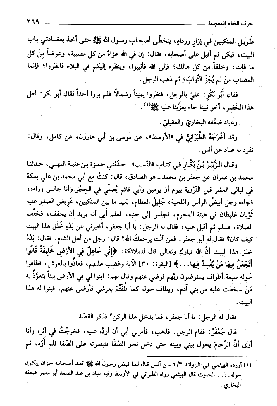 وقال الزّبير بن بكّار في كتاب «النّسب» : حدّثني حمزة بن عتبة اللهبي، حدثنا محمد بن عمران عن جعفر بن محمد- هو الصادق، قال: كنت مع أبي محمد بن علي بمكة في ليالي العشر قبل التّروية بيوم أو يومين وأبي قائم يصلّي في الحجر وأنا جالس وراءه، فجاءه رجل أبيض الرأس واللحية، جليل العظام، بعيد ما بين المنكبين، عريض الصدر عليه ثوبان غليظان في هيئة المحرم، فجلس إلى جنبه، فعلم أبي أنه يريد أن يخفف، فخفّف الصلاة، فسلم ثم أقبل عليه، فقال له الرجل: يا أبا جعفر، أخبرني عن بدء خلق هذا البيت كيف كان؟ فقال له أبو جعفر: فمن أنت يرحمك اللَّه؟ قال: رجل من أهل الشام. فقال: بدء خلق هذا البيت أنّ اللَّه تبارك وتعالى قال للملائكة: إِنِّي جاعِلٌ فِي الْأَرْضِ خَلِيفَةً قالُوا أَتَجْعَلُ فِيها مَنْ يُفْسِدُ فِيها ... [البقرة: ٣٠] الآية وغضب عليهم، فعاذوا بالعرش، فطافوا حوله سبعة أطواف يسترضون ربّهم فرضي عنهم وقال لهم: ابنوا لي في الأرض بيتا يتعوّذ به من سخطت عليه من بني آدم، ويطاف حوله كما طفتم بعرشي فأرضى عنهم. فبنوا له هذا البيت.