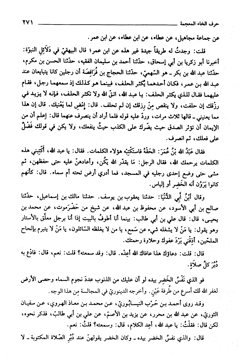 فقال عبد اللَّه بن عمر: الحقه فاستكتبه هؤلاء الكلمات. فقال: يا عبد اللَّه، أكتبني هذه الكلمات يرحمك اللَّه، فقال الرجل: ما يقدّر اللَّه يكن، وأعادهنّ عليه حتى حفظهن، ثم مشى حتى وضع إحدى رجليه في المسجد، فما أدري أرض تحته أم سماء. قال: كأنهم كانوا يرون أنه الخضر أو إلياس.