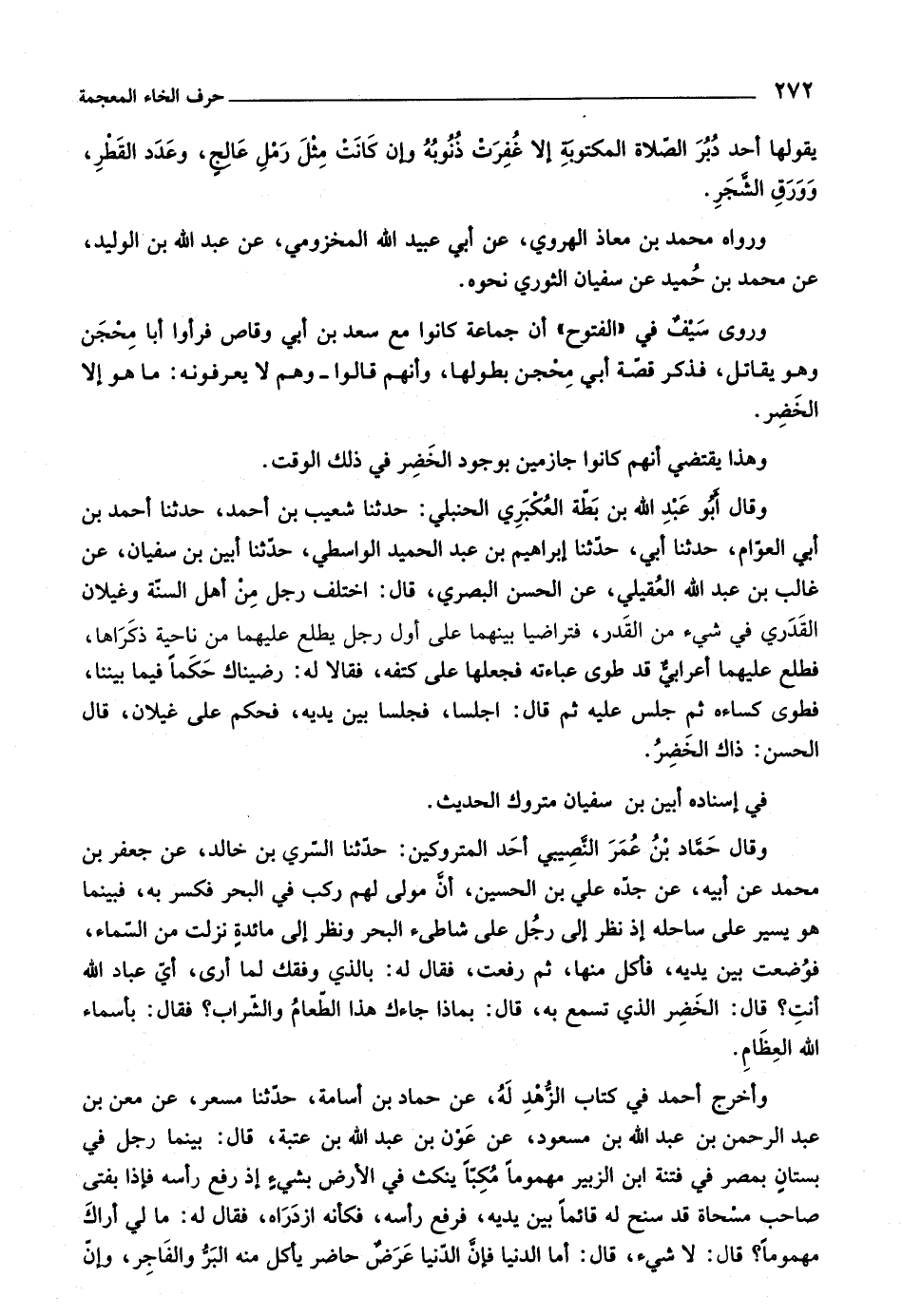 وقال أبو عبد اللَّه بن بطّة العكبريّ الحنبلي: حدثنا شعيب بن أحمد، حدثنا أحمد بن أبي العوّام، حدثنا أبي، حدّثنا إبراهيم بن عبد الحميد الواسطي، حدّثنا أبين بن سفيان، عن غالب بن عبد اللَّه العقيلي، عن الحسن البصري، قال: اختلف رجل من أهل السنّة وغيلان القدري في شيء من القدر، فتراضيا بينهما على أول رجل يطلع عليهما من ناحية ذكراها، فطلع عليهما أعرابيّ قد طوى عباءته فجعلها على كتفه، فقالا له: رضيناك حكما فيما بيننا، فطوى كساءه ثم جلس عليه ثم قال: اجلسا، فجلسا بين يديه، فحكم على غيلان، قال الحسن: ذاك الخضر.