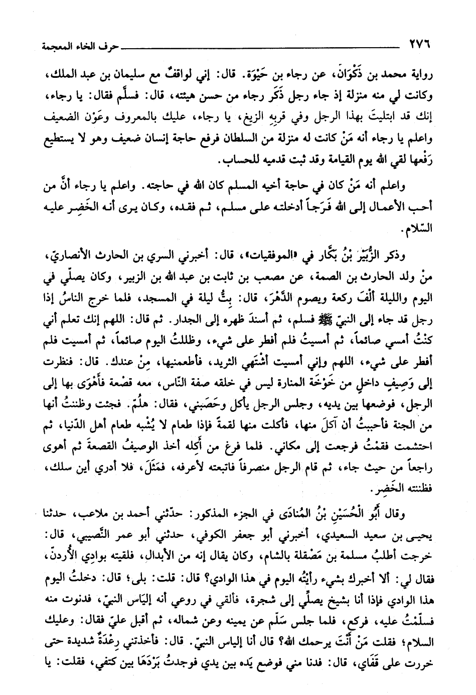 رواية محمد بن ذكوان، عن رجاء بن حيوة. قال: إني لواقف مع سليمان بن عبد الملك، وكانت لي منه منزلة إذ جاء رجل ذكر رجاء من حسن هيئته، قال: فسلّم فقال: يا رجاء، إنك قد ابتليت بهذا الرجل وفي قربه الزيغ، يا رجاء، عليك بالمعروف وعون الضعيف واعلم يا رجاء أنه من كانت له منزلة من السلطان فرفع حاجة إنسان ضعيف وهو لا يستطيع رفعها لقي اللَّه يوم القيامة وقد ثبت قدميه للحساب.