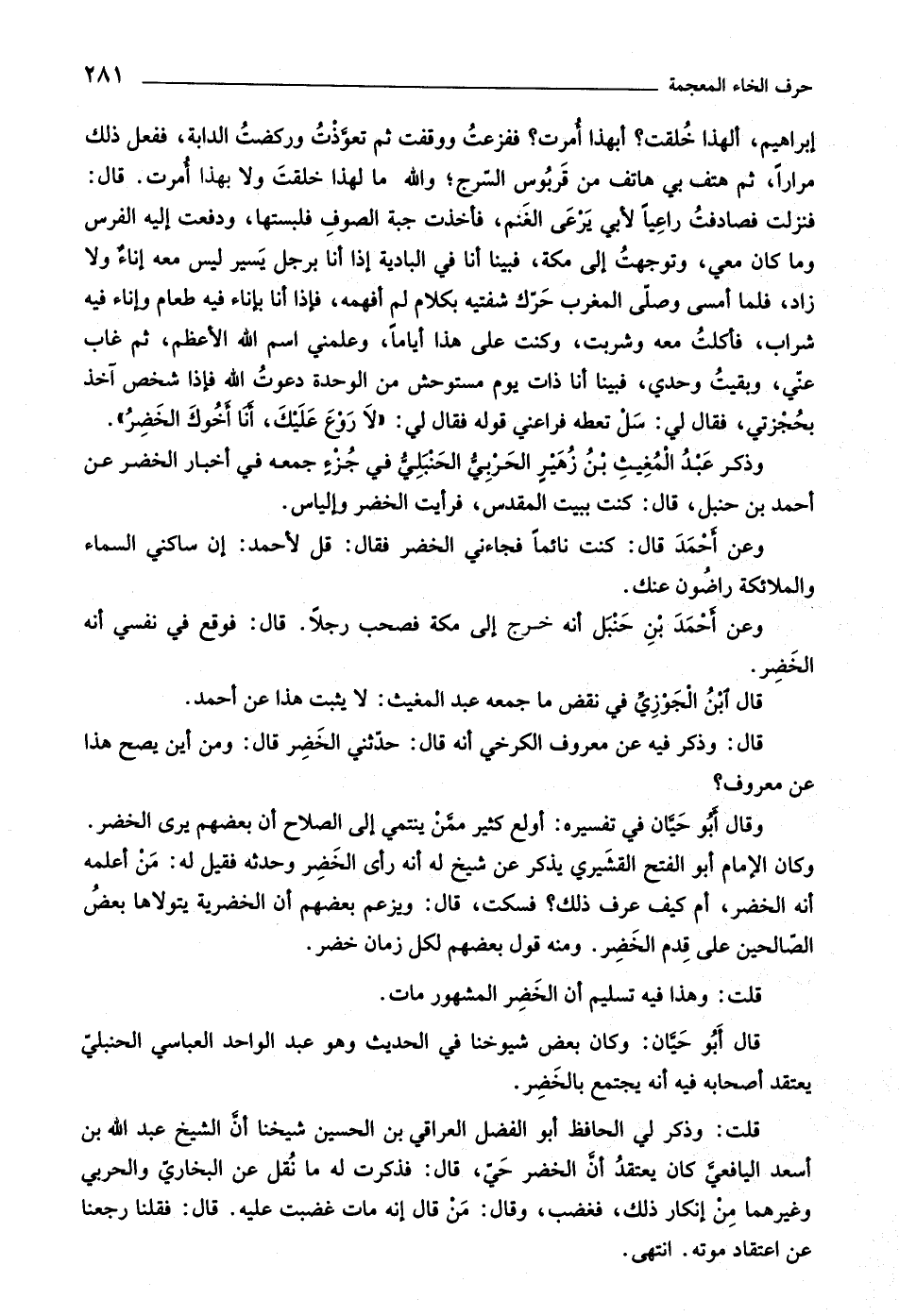 وعن أحمد بن حنبل أنه خرج إلى مكة فصحب رجلا. قال: فوقع في نفسي أنه الخضر.