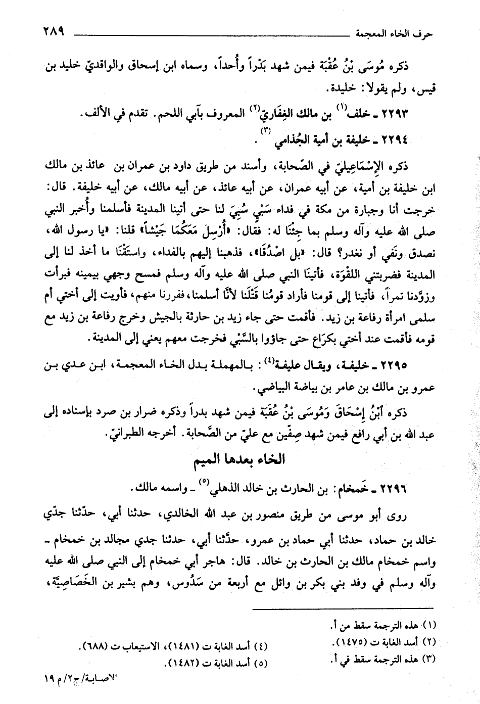 روى أبو موسى من طريق منصور بن عبد اللَّه الخالديّ، حدثنا أبي، حدّثنا جدّي خالد بن حماد، حدثنا أبي حماد بن عمرو، حدّثنا أبي، حدثنا جدي مجالد بن خمخام- واسم خمخام مالك بن الحارث بن خالد. قال: هاجر أبي خمخام إلى النبي صلّى اللَّه عليه وآله وسلم في وفد بني بكر بن وائل مع أربعة من سدوس، وهم بشير بن الخصاصيّة،