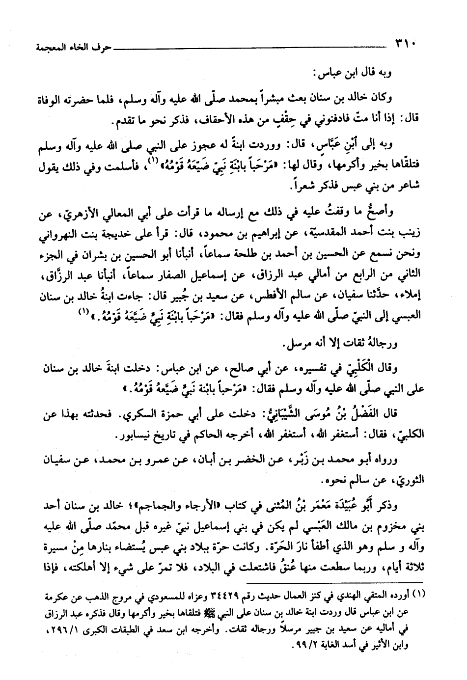 على أبي المعالي الأزهريّ، عن زينب بنت أحمد المقدسيّة، عن إبراهيم بن محمود، قال: قرأ على خديجة بنت النهرواني ونحن نسمع عن الحسين بن أحمد بن طلحة سماعا، أنبأنا أبو الحسين بن بشران في الجزء الثاني من الرابع من أمالي عبد الرزاق، عن إسماعيل الصفار سماعا، أنبأنا عبد الرزّاق، إملاء، حدّثنا سفيان، عن سالم الأفطس، عن سعيد بن جبير قال: جاءت ابنة خالد بن سنان العبسيّ إلى النبيّ صلّى اللَّه عليه وآله وسلم فقال: «مرحبا بابنة نبيّ ضيّعه قومه.»