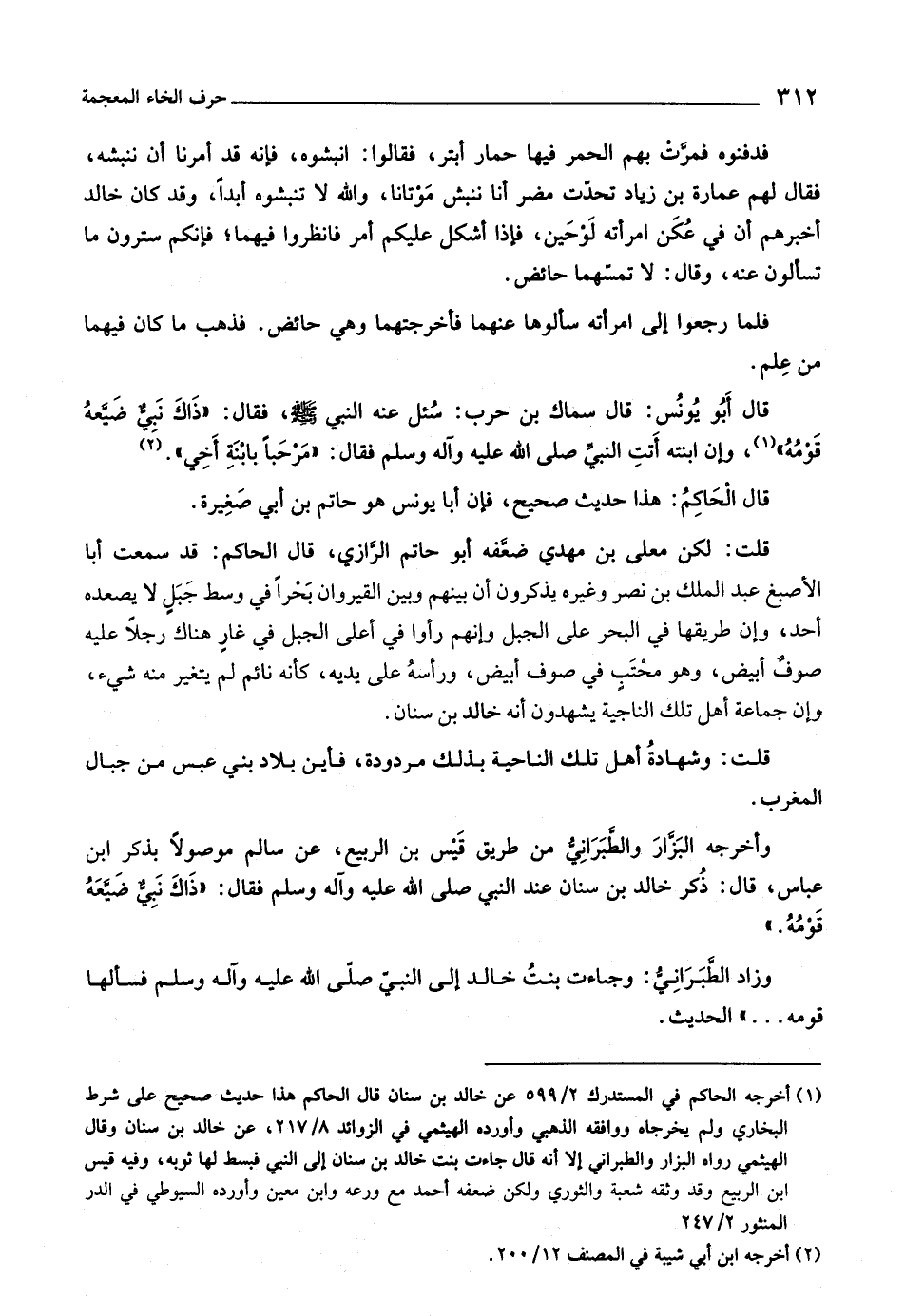 قلت: لكن معلى بن مهدي ضعّفه أبو حاتم الرّازي، قال الحاكم: قد سمعت أبا الأصبغ عبد الملك بن نصر وغيره يذكرون أن بينهم وبين القيروان بحرا في وسط جبل لا يصعده أحد، وأن طريقها في البحر على الجبل وإنهم رأوا في أعلى الجبل في غار هناك رجلا عليه صوف أبيض، وهو محتب في صوف أبيض، ورأسه على يديه، كأنه نائم لم يتغير منه شيء، وإن جماعة أهل تلك الناجية يشهدون أنه خالد بن سنان.