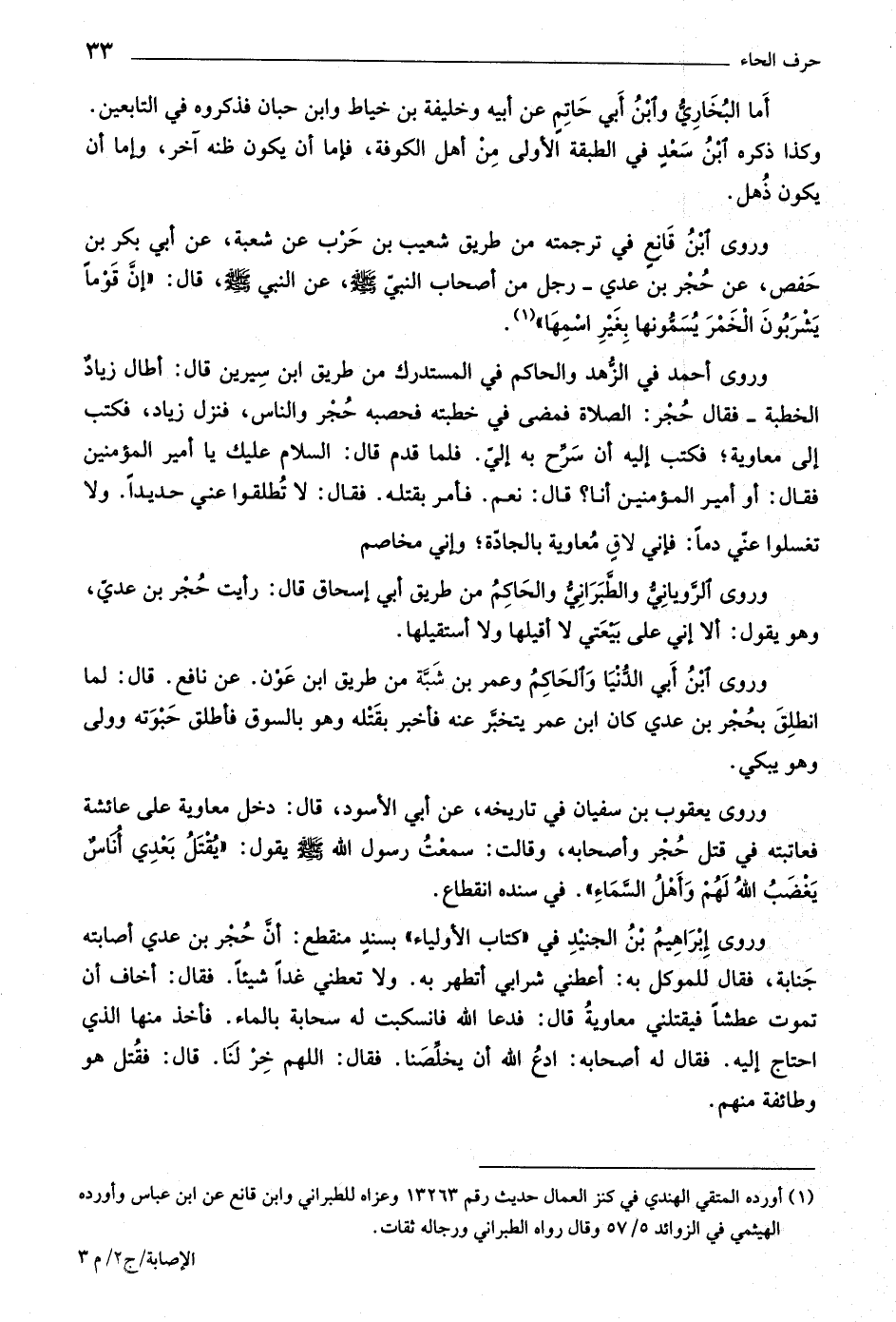 «١» . وروى أحمد في الزّهد والحاكم في المستدرك من طريق ابن سيرين قال: أطال زياد الخطبة- فقال حجر: الصلاة فمضى في خطبته فحصبه حجر والناس، فنزل زياد، فكتب إلى معاوية، فكتب إليه أن سرّح به إليّ. فلما قدم قال: السلام عليك يا أمير المؤمنين فقال: أو أمير المؤمنين أنا؟ قال: نعم. فأمر بقتله. فقال: لا تطلقوا عني حديدا. ولا تغسلوا عنّي دما: فإنّي لاق معاوية بالجادّة، وإني مخاصم وروى الرّويانيّ والطّبرانيّ والحاكم من طريق أبي إسحاق قال: رأيت حجر بن عديّ، وهو يقول: ألا إني على بيعتي لا أقيلها ولا أستقيلها.