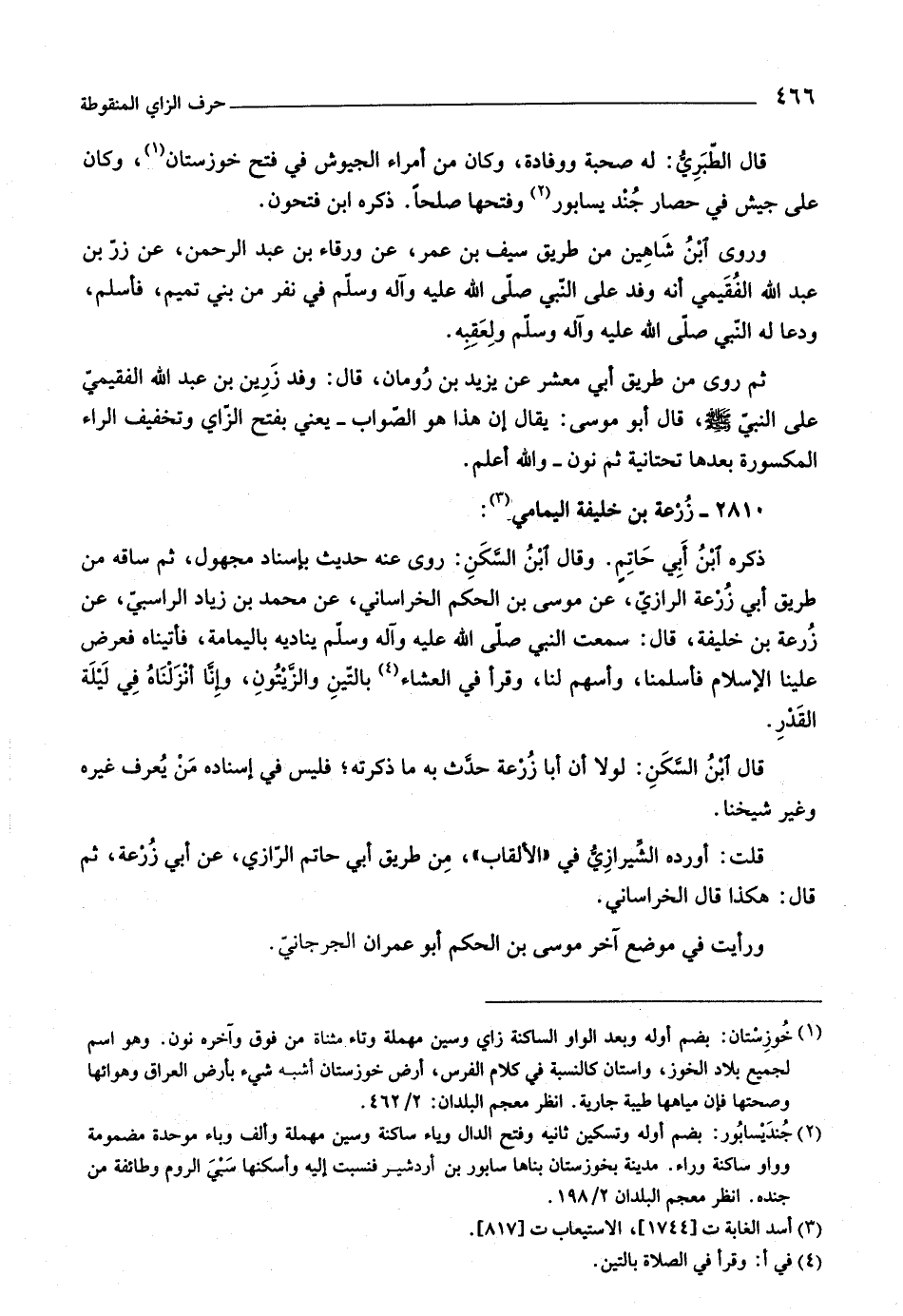ثم روى من طريق أبي معشر عن يزيد بن رومان، قال: وفد زرين بن عبد اللَّه الفقيميّ على النبيّ صلّى اللَّه عليه وسلّم، قال أبو موسى: يقال إن هذا هو الصّواب- يعني بفتح الزّاي وتخفيف الراء المكسورة بعدها تحتانية ثم نون- واللَّه أعلم.