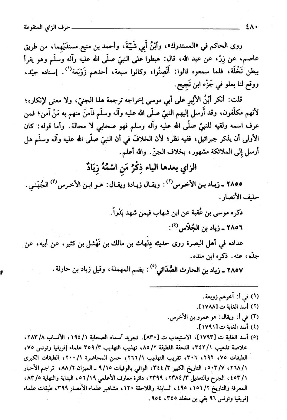 قلت: أنكر ابن الأثير على أبي موسى إخراجه ترجمة هذا الجنيّ، ولا معنى لإنكاره، لأنهم مكلّفون، وقد أرسل إليهم النبيّ صلّى اللَّه عليه وآله وسلّم فآمن منهم به من آمن، فمن عرف اسمه ولقيه للنبيّ صلّى اللَّه عليه وآله وسلم فهو صحابي لا محالة. وأما قوله: كان الأولى أن يذكر جبرائيل، ففيه نظر، لأن الخلاف في أن النبيّ صلّى اللَّه عليه وآله وسلّم هل أرسل إلى الملائكة مشهور، بخلاف الجنّ. واللَّه أعلم.