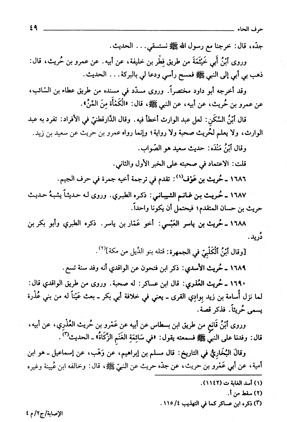 قال ابن السّكن: لعل عبد الوارث أخطأ فيه. وقال الدّارقطنيّ في الأفراد: تفرد به عبد الوارث، ولا يعلم لحريث صحبة ولا رواية، وإنما رواه عمرو بن حريث عن سعيد بن زيد.