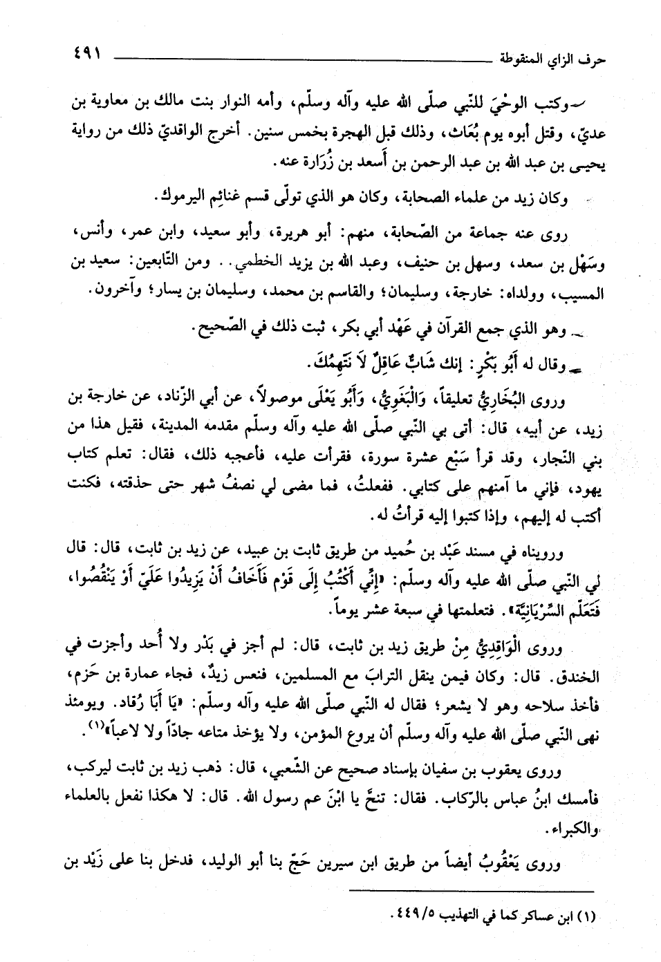 ورويناه في مسند عبد بن حميد من طريق ثابت بن عبيد، عن زيد بن ثابت، قال: قال لي النّبي صلّى اللَّه عليه وآله وسلّم: «إنّي أكتب إلى قوم فأخاف أن يزيدوا عليّ أو ينقصوا، فتعلّم السّريانيّة» . فتعلمتها في سبعة عشر يوما.