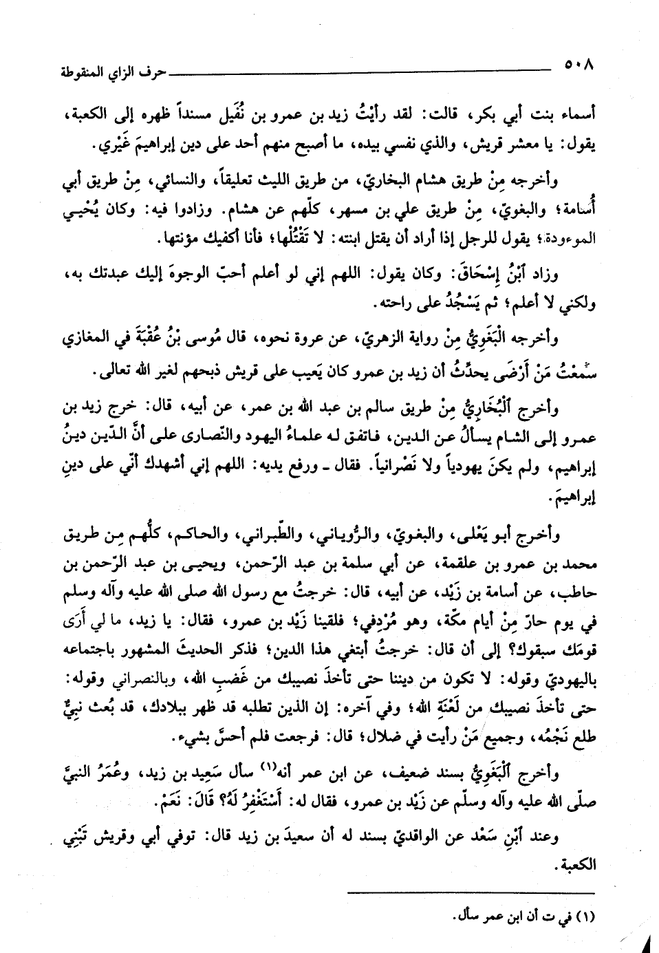 وأخرج أبو يعلى، والبغويّ، والرّوياني، والطّبراني، والحاكم، كلّهم من طريق محمد بن عمرو بن علقمة، عن أبي سلمة بن عبد الرّحمن، ويحيى بن عبد الرّحمن بن حاطب، عن أسامة بن زيد، عن أبيه، قال: خرجت مع رسول اللَّه صلى اللَّه عليه وآله وسلم في يوم حارّ من أيام مكّة، وهو مردفي، فلقينا زيد بن عمرو، فقال: يا زيد، ما لي أرى قومك سبقوك؟ إلى أن قال: خرجت أبتغي هذا الدين، فذكر الحديث المشهور باجتماعه باليهوديّ