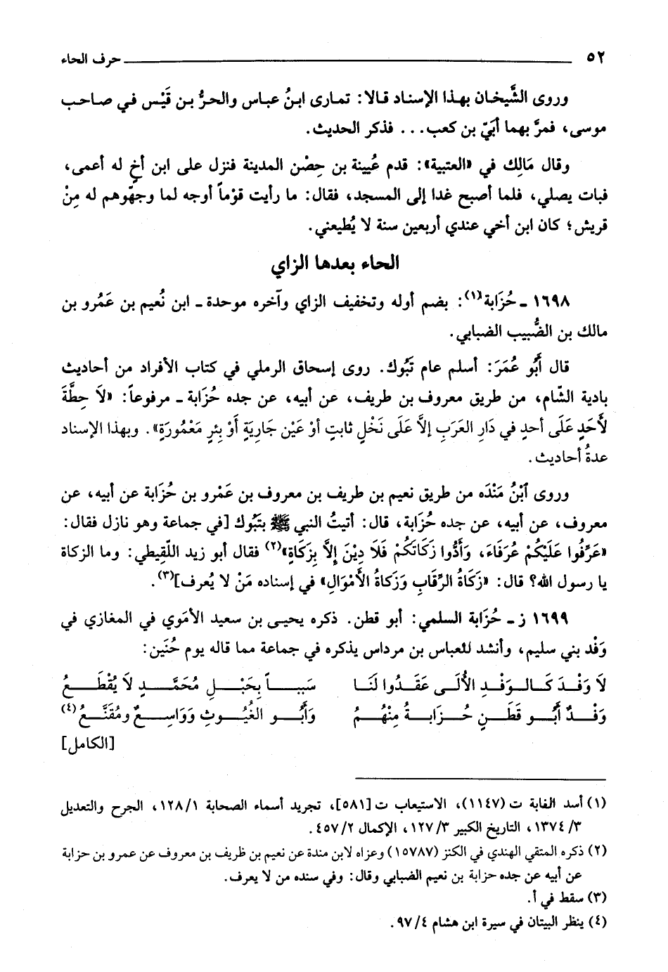 روى إسحاق الرمليّ في كتاب الأفراد من أحاديث بادية الشّام، من طريق معروف بن طريف، عن أبيه، عن جده حزابة- مرفوعا: «لا حطّة لأحد على أحد في دار العرب إلّا على نخل ثابت أو عين جارية أو بئر معمورة» .